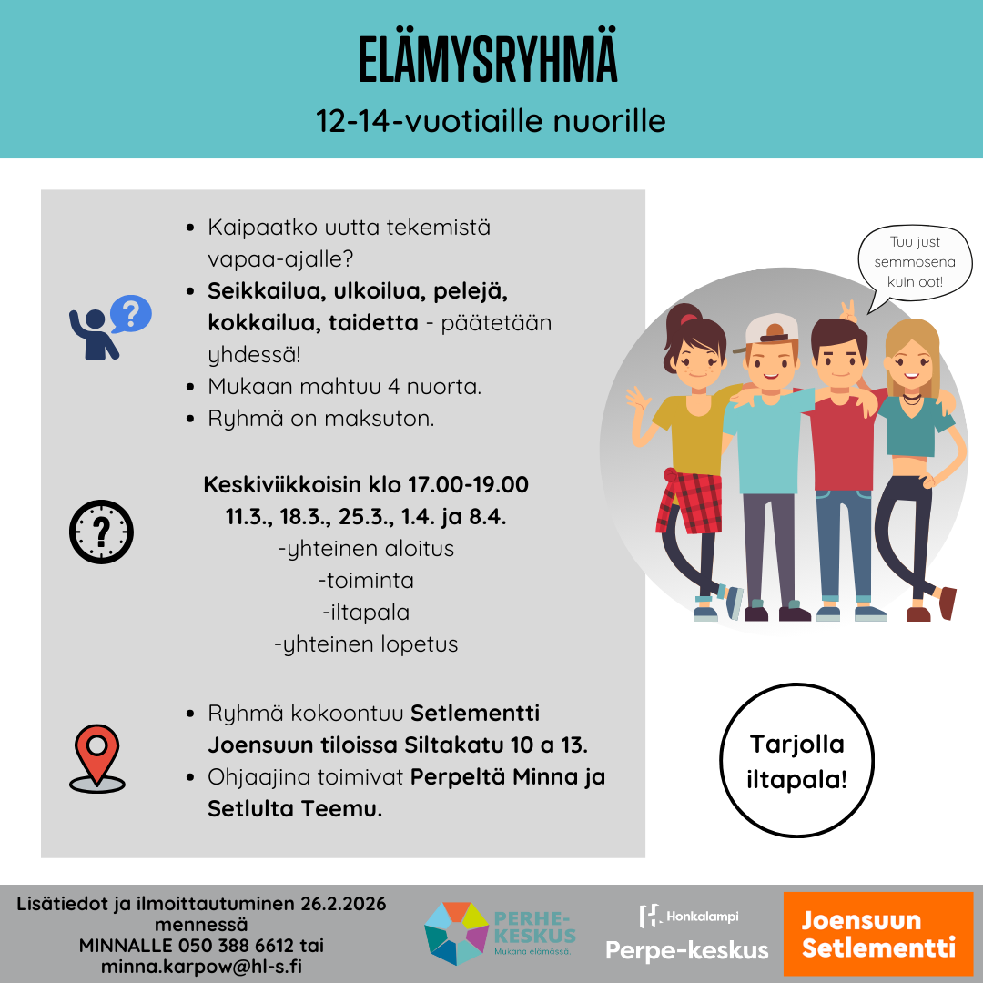 Elämysryhmä 12-14-vuotiaille nuorille käynnistyy Joensuussa 11.3.2026