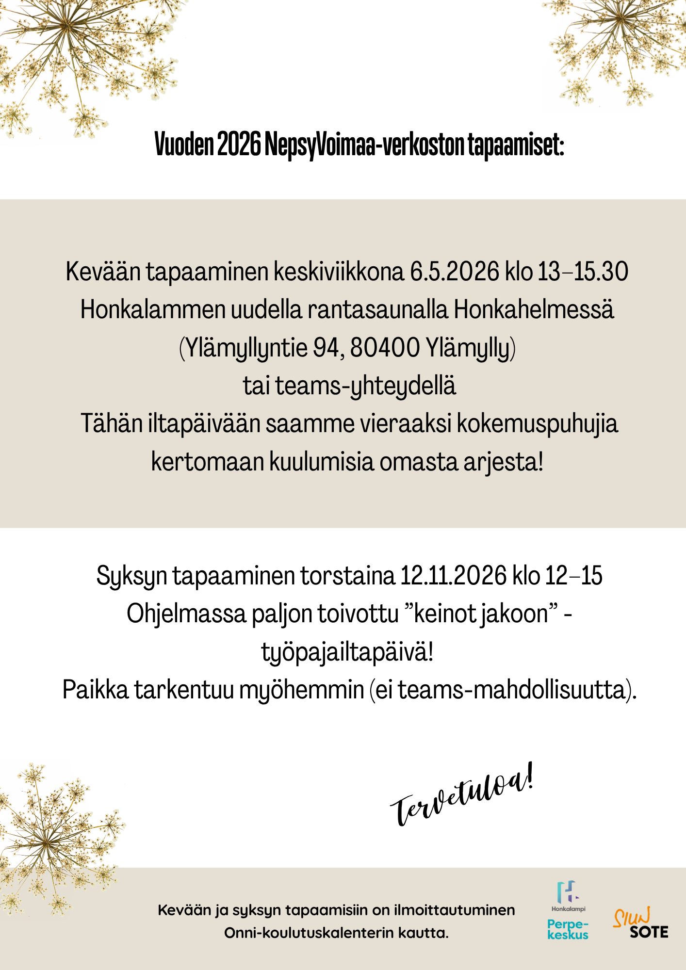 NepsyVoimaa -verkosto kokoontuu keväällä 6.5. klo 13-15:30 Honkalammen rantasaunalla Honkahelmessä Ylämyllyntie 94, 80400 Ylämylly tai Teams-yhteydellä.