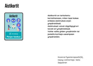 Aistikortit on tarkoitettu kartoittamaan, miten lapsi kokee erilaisia aistimuksia arjen ympäristöissä. Aistimukset voivat näyttäytyä eri tavoin eri ympäristöissä. Voitte valita yhden ympäristön tai jaotella kortteja useampaan ympäristöön.