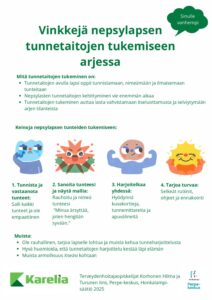 Erilaisia arjen tilanteita ja niissä nousevia tunteita voi jälkikäteen purkaa ja pohtia esimerkiksi tällaisen työkalun kanssa. Itseymmärrys lisää myös kykyä säädellä tunteita.